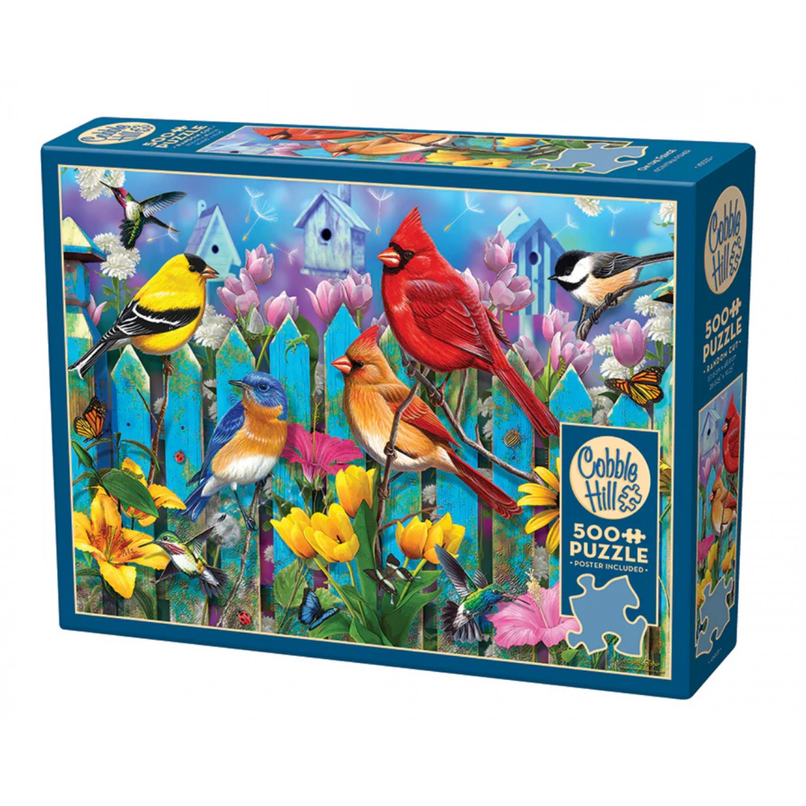 Sitting On The Fence are many different birds who appear to be enjoying the flowers and the busyness of the hummingbirds fluttering about. There are a lot of blue tones and pinks in this 500 piece puzzle with splashes of yellow in the bird and flowers. Also, there are Monarch butterflies and ladybugs to brighten up your day!