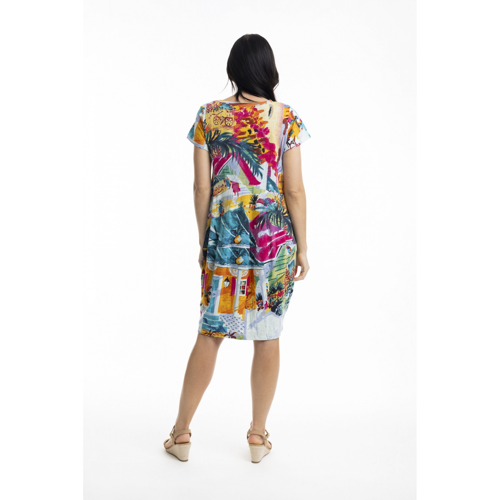 Shine in our colourful Copacabana bubble dress. Featuring an open neckline, relaxed short sleeves, diagonal waist seam, and practical pockets, this dress showcases gorgeous colours and prints perfect for summer. Its flowing silhouette offers both comfort and style, making it ideal for beach outings and leisurely strolls. The perfect effortless summer dress!
