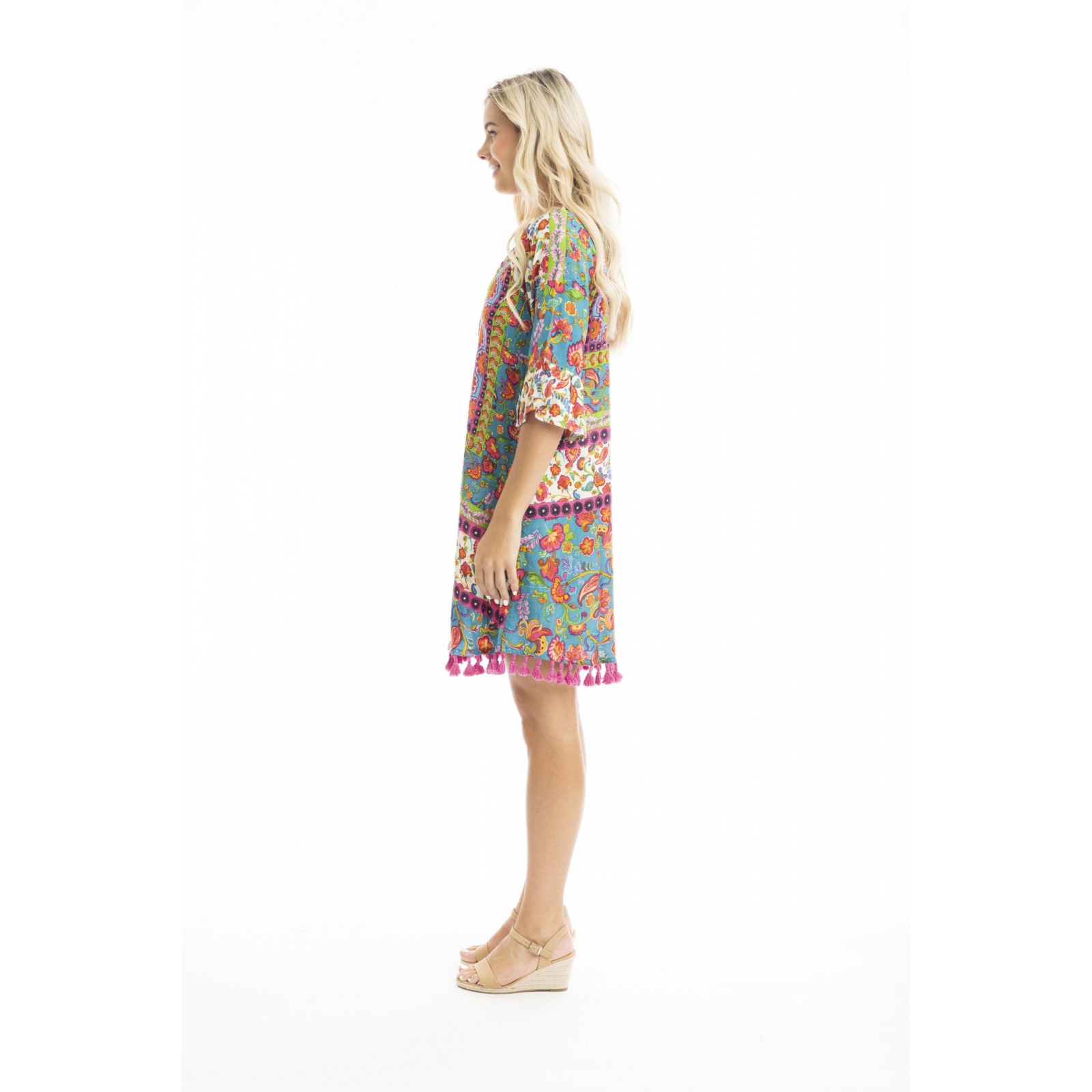 Add a splash of colour to your look with our Carvalho boho dress! With playful three-quarter frill sleeves, an open neckline adorned with playful tassel details, and a relaxed fit, this dress is crafted from premium natural fibres, ensuring both comfort and style. The perfect dress for your everyday summer wardrobe!